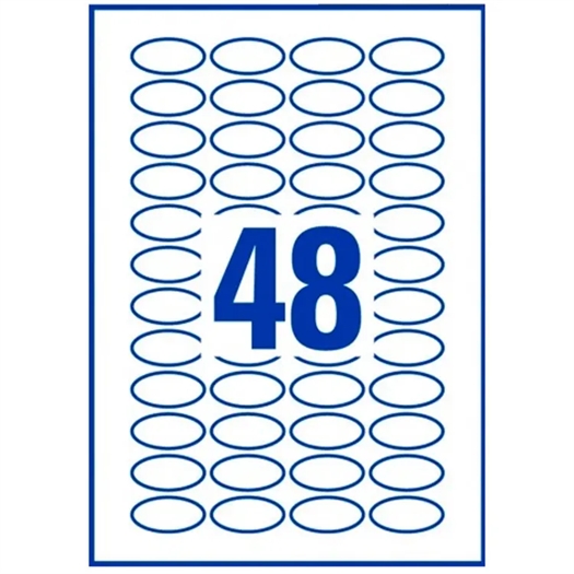 A4-ark med udstansede ovale etiketter i ekstra kraftig high gloss papirkvalitet (laserprint) og med permanent lim. I alt 9600 etiketter pr. æske. Til denne vare tilbyder vi skabelon til Microsoft Word.